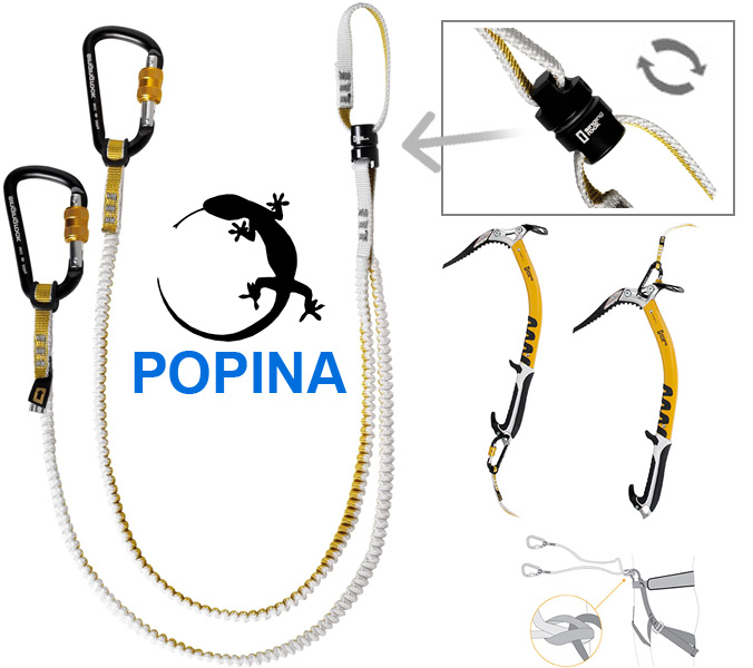Leichtes Schlingensystem für Eisgeräte ohne Handschlaufen. Die Karabiners werden an Spitze oder Kopf der Eisgeräte befestigt, das patentrechtlich geschützte, elastische Gurtband sorgt für maximale Reichweite. Inkl 2 Karabiner.